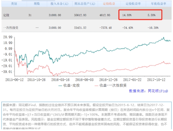 结果能否令你大吃一惊,在这时期大盘回调超过了30%,而定投竟然完成了5.58%的年化收益,比部分银行理财还要高。