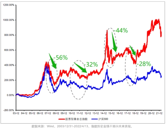 Wind股票型基金总指数基日(2003-12-31)以来下跌793%,长期持有轻松获得13%的年化收益率~(来源:Wind,截止2022-4-20)