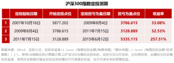 假如我们能在扭亏为盈后再坚持一下,到下一个阶段高点再中止定投,收益率会非常不错。特别是从2011年7月15日定投到2015年6月12日,会播种最高达257.51%的定投收益率。