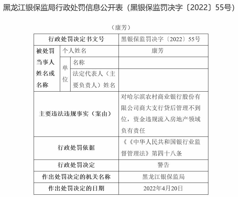 黑龙江一女子骗贷获刑 哈尔滨农商行被骗96.5万