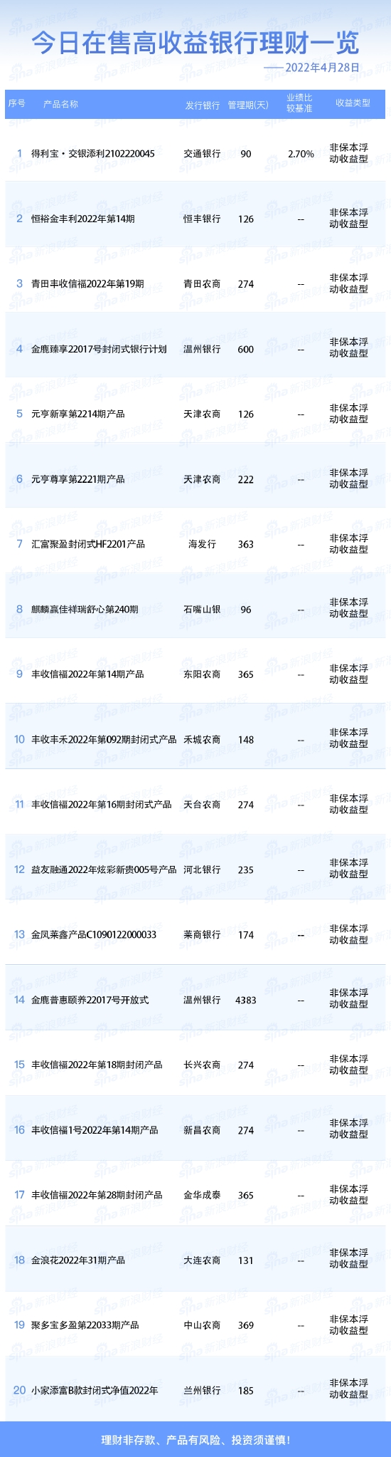 银行4月28日在售高收益理财产品一览