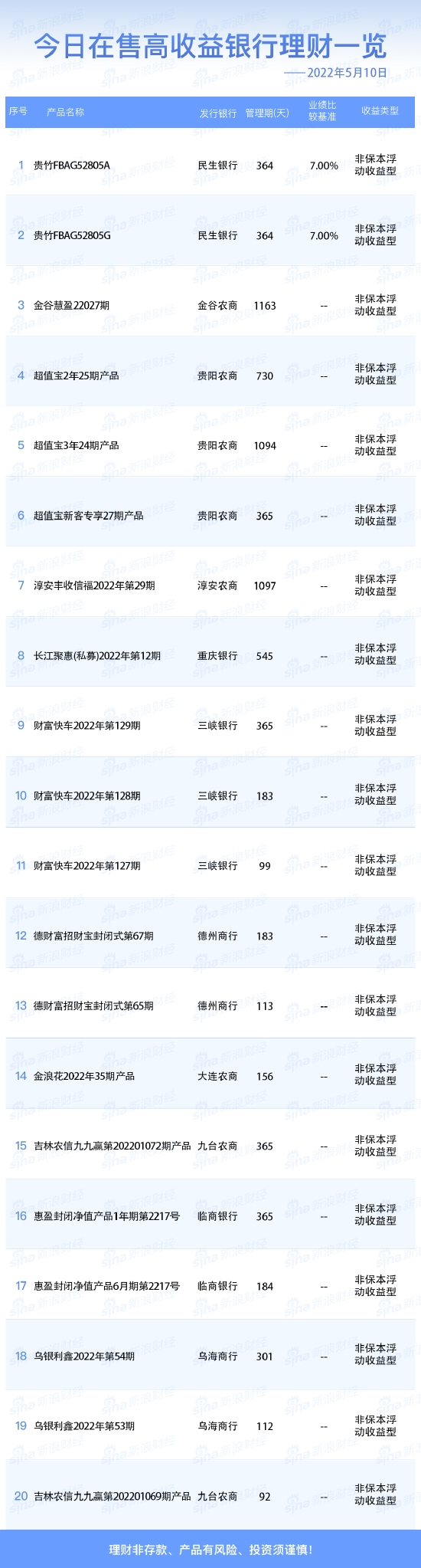 新浪财经5月10日在售高收益银行理财产品一览。今日业绩比较基准在7.00%及以上的银行人民币理财产品共2款。理财非存款、产品有风险、投资须谨慎!