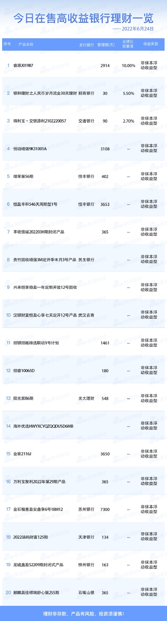6月24日在售高收益银行理财产品一览。今日业绩比较基准在2.70%及以上的银行人民币理财产品共3款。理财非存款、产品有风险、投资须谨慎!