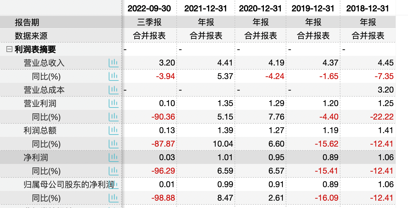 具体来看,去年前三季度,该行归母净利润仅0.01亿元,较2021年同期同比下降98.88%;营收3.20亿元,同比减少0.13亿元,同比下降3.94%。