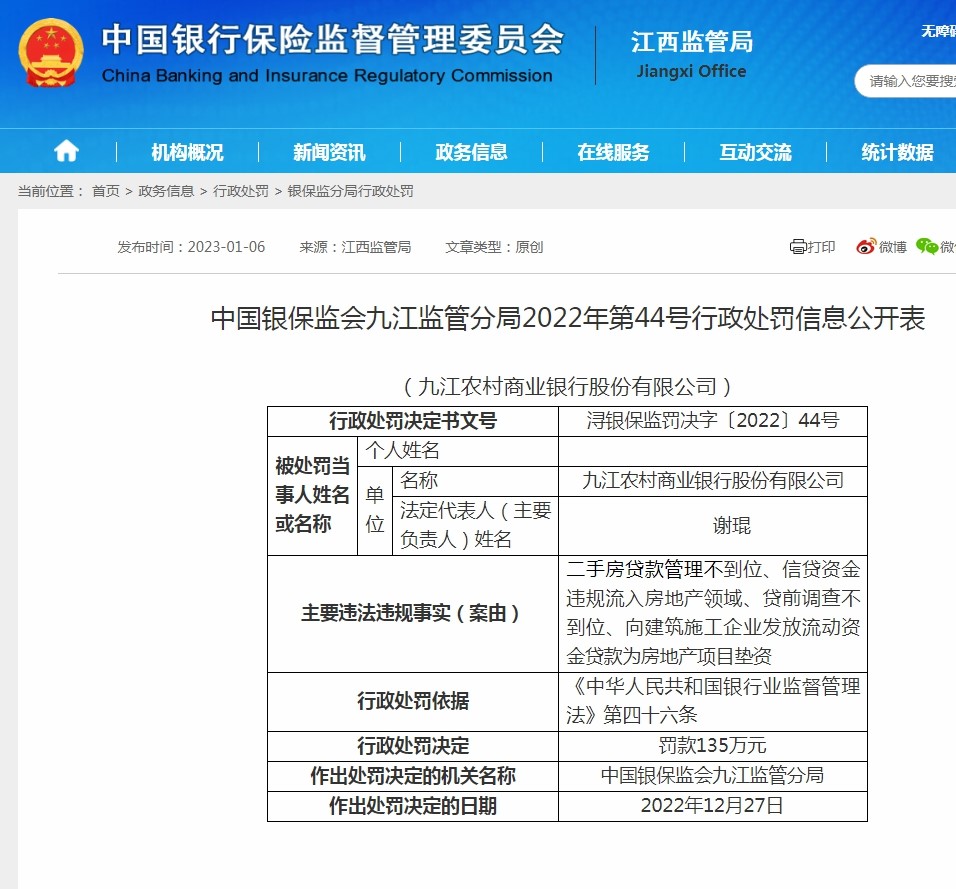 1月6日,中国银保监会官网显示,九江农商行因贷款领域的四项违法违规事由,被九江银保监分局开出8张罚单,处以?135万元,有7名直接责任人被予以警告。