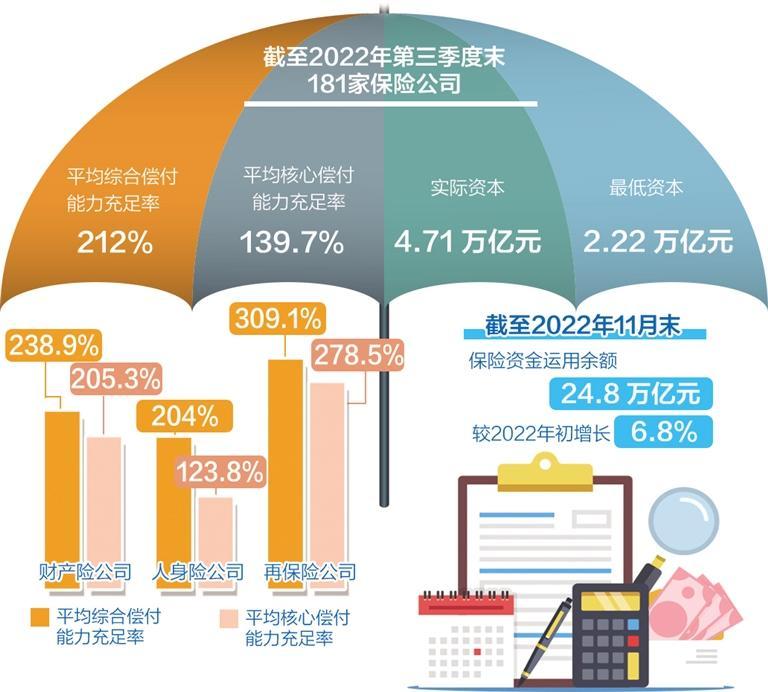 银保监会数据显示,截至2022年第三季度末,纳入偿付才能监管委员会工作会议审议的181家保险公司均匀综合偿付才能充足率为212%,均匀核心偿付才能充足率为139.7%;实践资本为4.71万亿元,最低资本为2.22万亿元。财产险公司、人身险公司、再保险公司的均匀综合偿付才能充足率分别为238.9%、204%和309.1%;均匀核心偿付才能充足率分别为205.3%、123.8%和278.5%。