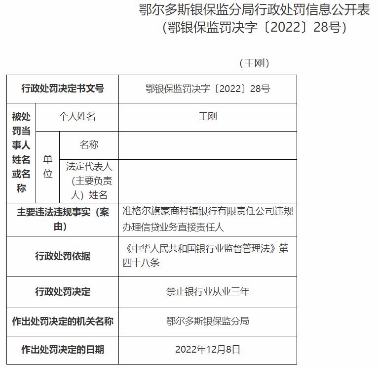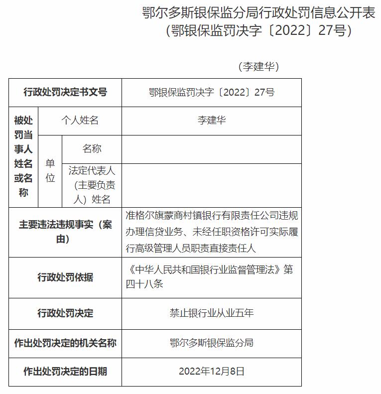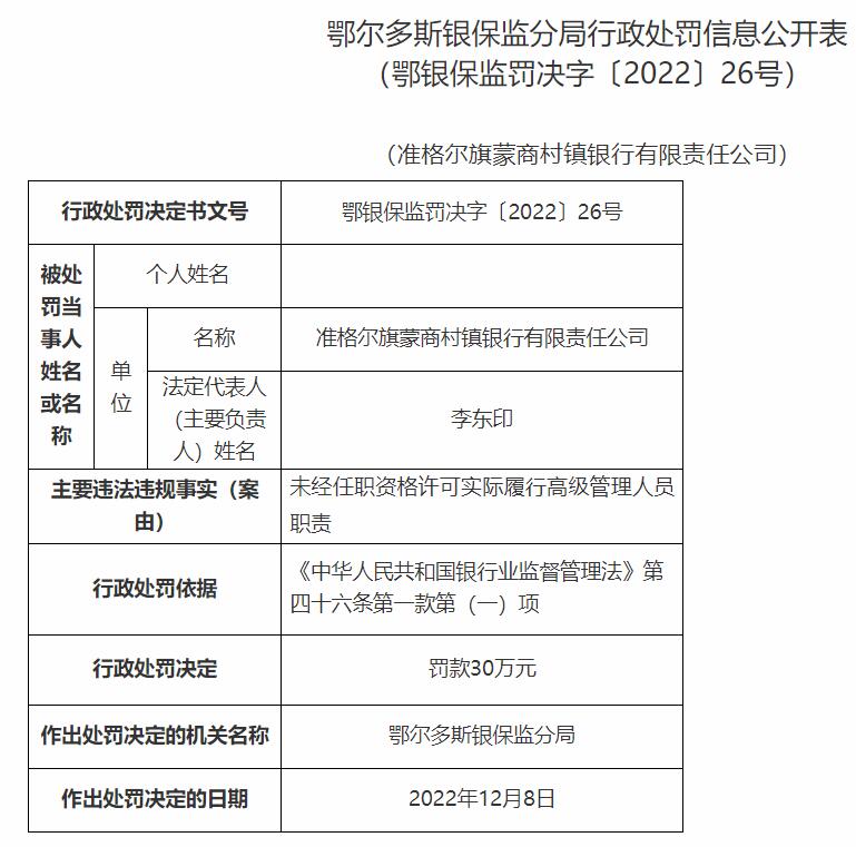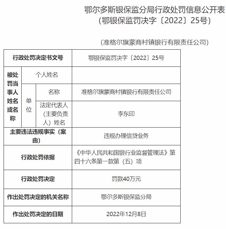 准格尔旗蒙商村镇银行被罚25万