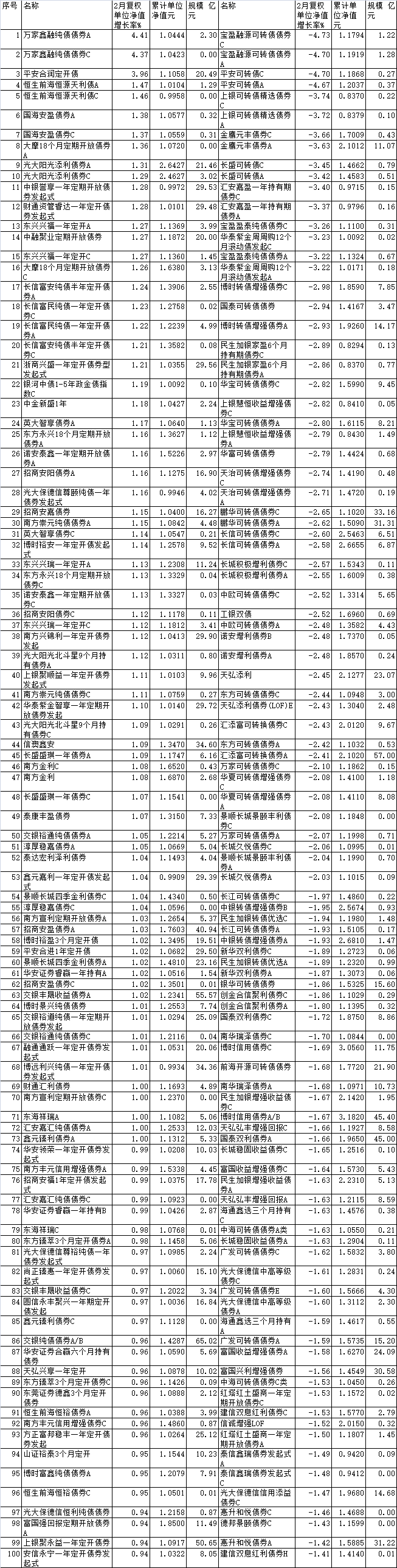从涨幅榜看,万家鑫融纯债债券A、万家鑫融纯债债券C以4.41%和4.37%的表现名列前茅,安全合润定开债也在2月份下跌了3.96%,位居第三名,其他有70只债基涨幅在1%至1.5%之间。