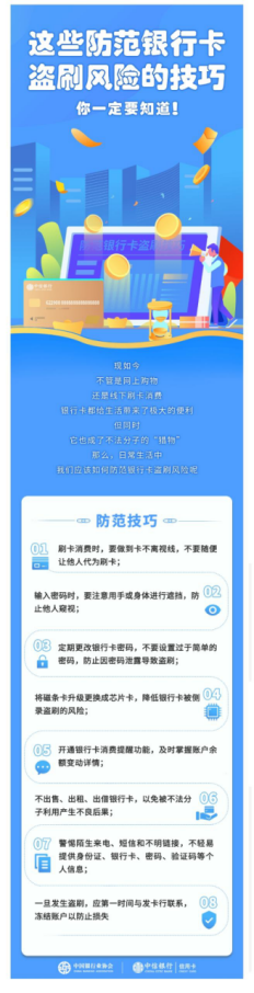 当前,不管是网上购物还是线下刷卡消费,银行卡都给生活带来了极大的便利。但同时,如保管不当,它也容易成为不法分子盗取的“猎物”。不法分子经过非法复制银行卡,从而盗取账户资金,导致持卡人名下的信誉卡被盗刷消费或转账提现。对此,中信银行信誉卡结合多个用卡场景,总结出8个银行卡防盗刷技巧,协助广大消费者守住“钱袋子”: