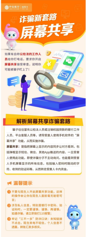 屏幕共享,本来是指把屏幕上显示的内容同步让对方看到,包括弹框显示短信、微信、其他App推送的内容。一旦受益人运用此功能,即便诈骗分子不自动讯问,也能看到受益人手机屏幕显示的一切信息,包括输入密码时跳动的字符、收到的验证码等,从而转走受益人的银行卡资金。中信银行信誉卡提示广大消费者,要提升新型诈骗反诈看法,时辰警惕个人信息泄露风险: