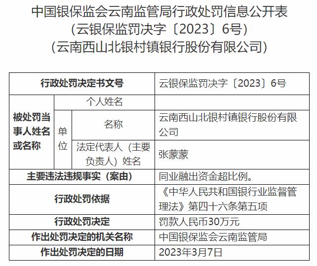 云南西山北银村镇银行被罚30万元