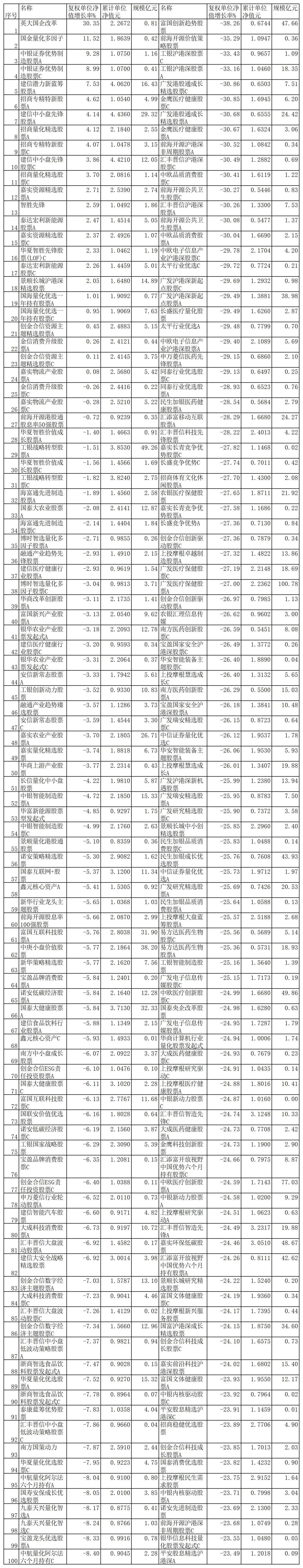 前8月普通股票型基金涨跌幅前100名一览