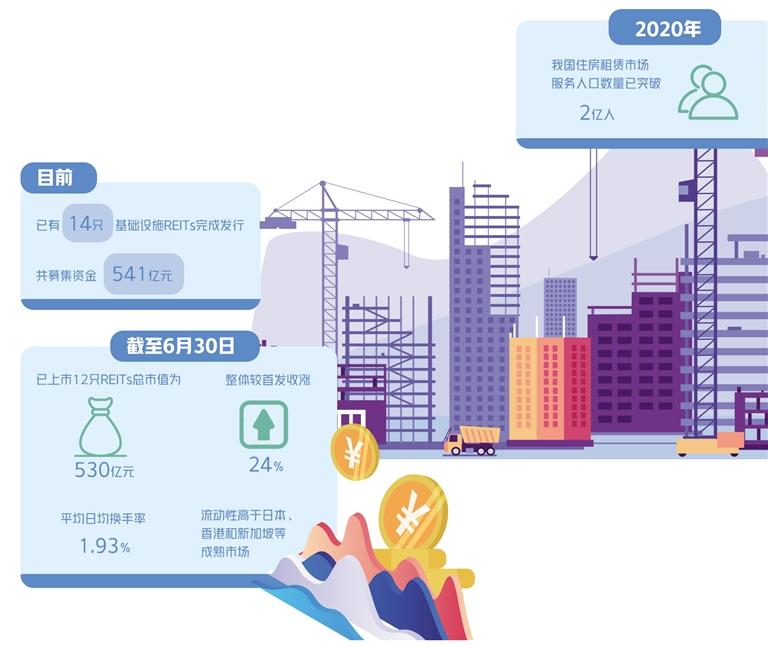 目前,我国REITs试点工作推进顺利,市场初具规!=刂聊壳,已有14只350vip葡亰集团REITs完成发行,共募集资金541亿元;截至6月30日,已上市12只REITs总市值为530亿元,全体较首发收涨24%;均匀日均换手率1.93%,流动性高于日本和新加坡等成熟市场。