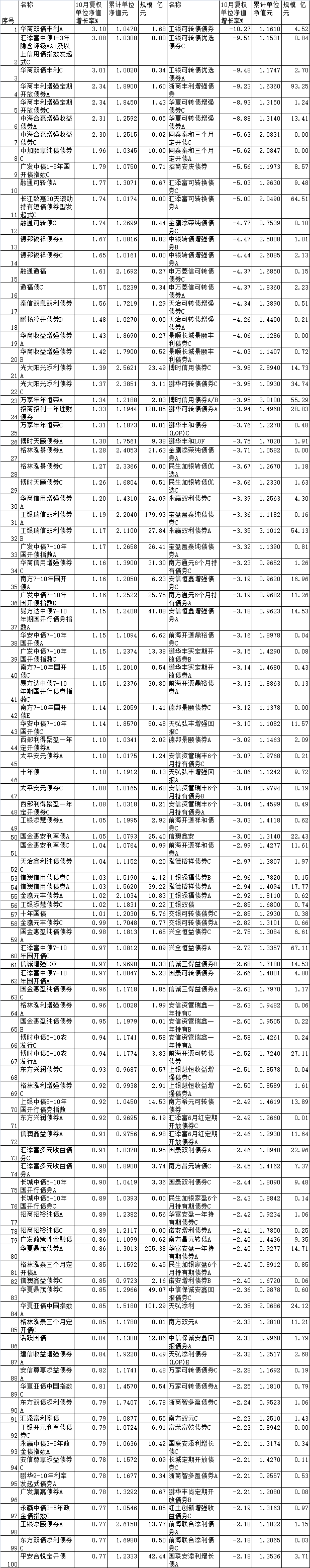 10月份债券型基金涨跌幅前100名一览